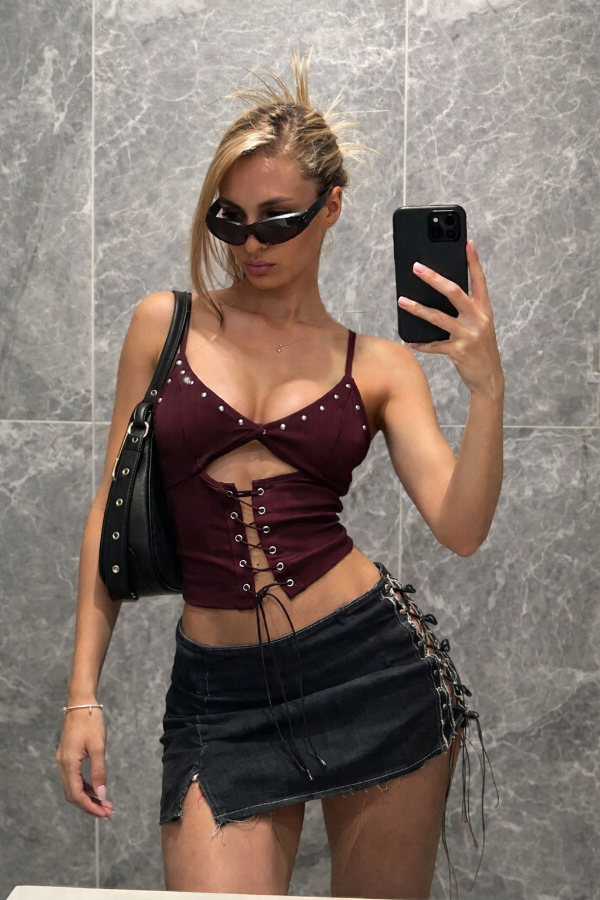 Top negro estilo corset con recorte delantero y detalle de tachas metálicas en el busto. Cuenta con breteles finos y ajuste frontal con cordones que permite adaptarlo al cuerpo