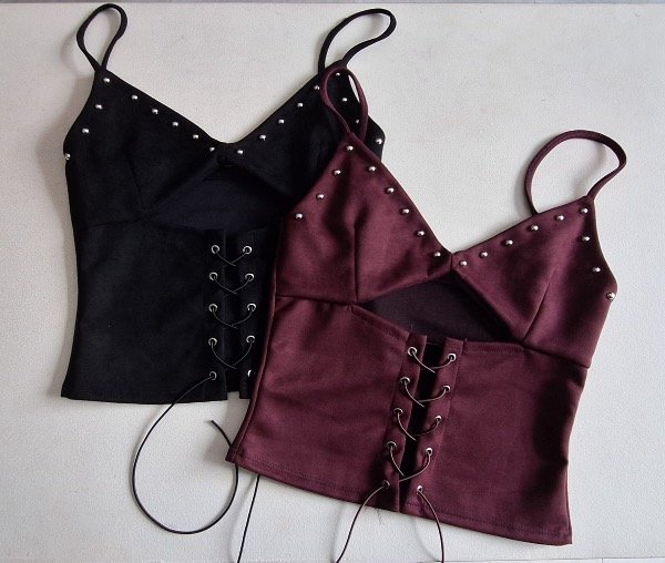 Top negro estilo corset con recorte delantero y detalle de tachas metálicas en el busto. Cuenta con breteles finos y ajuste frontal con cordones que permite adaptarlo al cuerpo